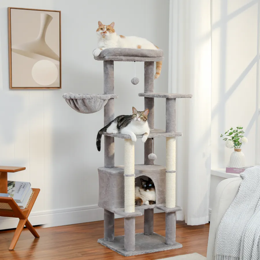 The PAWZ Road 55" Plush Sisal Scratching Post Indoor Cat Tree is the ultimate kitty haven! With 4 sisal-covered scratching posts, a top perch, a hammock bed, and a spacious cat cave condo, it`s perfect for 2-3 cats of any age. Plus, it`s made of sturdy particle board and plush material with an anti-topple strap for extra stability - so your furry friends can jump, play, and nap safely. Treat your cats right with this purr-fect cat tree!